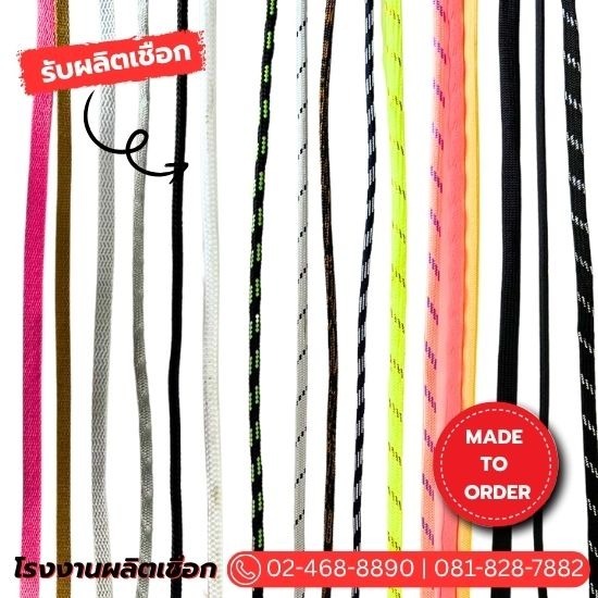 รับผลิตเชือกตามแบบ โรงงานผลิตเชือกตามความต้องการในราคาถูก เพื่อได้เชือกตามสเปคที่ลูกค้าต้องการ (Made to order)  สามารถสั่งผลิตได้ทุกแบบ ทุกขนาด ทุกสี เช่น เชือกมัดเปล เชือกมัดท้าย เชือกกางเกง โรงงานผลิตเชือกรองเท้า สายคล้องคอ สายคล้องบัตร สายกระเป๋า เชือกร่ม เชือกถัก เชือกทอ เชือกเทป เทปพัน เทปก้างปลา เทปต่อไหล่ เทปPP